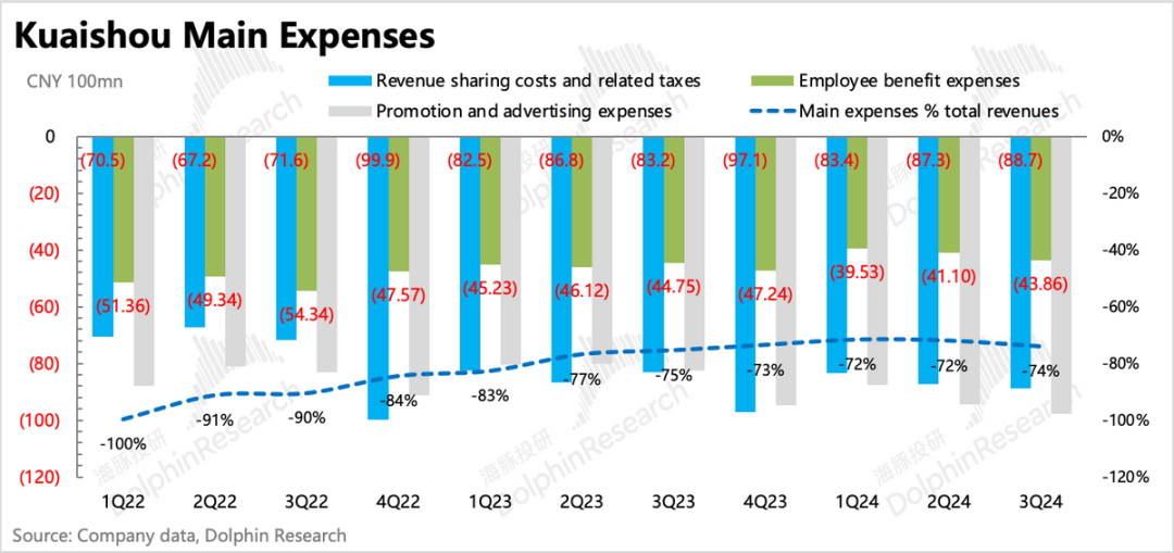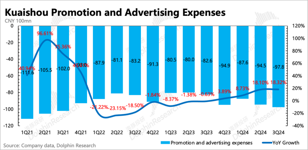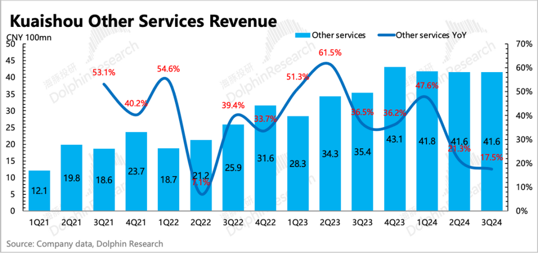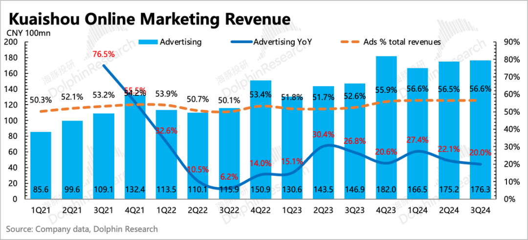 三季度廣告收入基本符合預期,同比增長20%,實現176億元。三季度的增長主要還是靠外循環廣告的拉動,尤其是行業景氣度高的短劇,競争激烈的電商、本地生活等領域的廣告主投放。