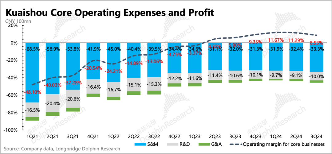 由于快手的淨利潤包含了一些利得收入(政府補貼、理财收入等),因此如果隻看主營業務的表現,海豚君一般會關注核心經營利潤指标(收入-成本-經營費用)。三季度核心經營利潤實現26.5億,利潤率8.5%,環比來看同樣在快速下滑。