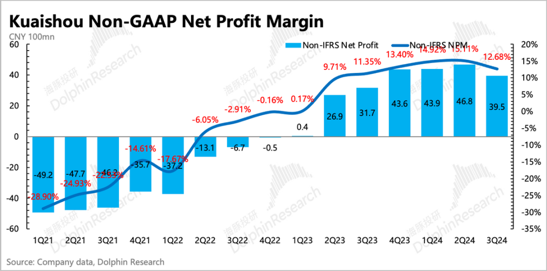 三季度快手實現GAAP下淨利潤32.7億,環比繼續下降。就算加回SBC調整後的Non-GAAP下淨利潤也是39.5億小于上季度的46.8億,利潤率也環比下滑了2個多點。