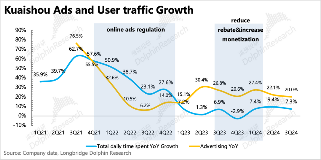 Q3總用戶單日時長流量增速繼續增長7%,源于DAU流量同比增長以及日均時長的提升,預計同樣給到廣告加速增長帶來一些支撐。