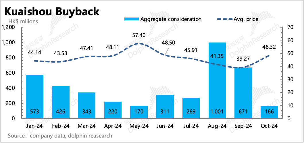截至三季度末,快手賬面有現金+存款=234億,如果加上短期投資的金融資産,合計508億,扣掉長期借款之後的淨現金有418億。目前主業經營上早已盈利和現金流轉正并不太會耗用太多現金,現金流已經沒有壓力。因此,如果想要增加回購力度,也并沒有絕對的阻礙。