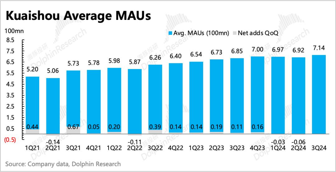 三季度快手月活7.14億,繼續環比增加了2200萬人,優于市場預期。市場的預期一般是結合公司的指引和第三方數據平台跟蹤的趨勢來綜合判斷。但快手的表現相比于第三方平台顯示的趨勢,要好的多。
