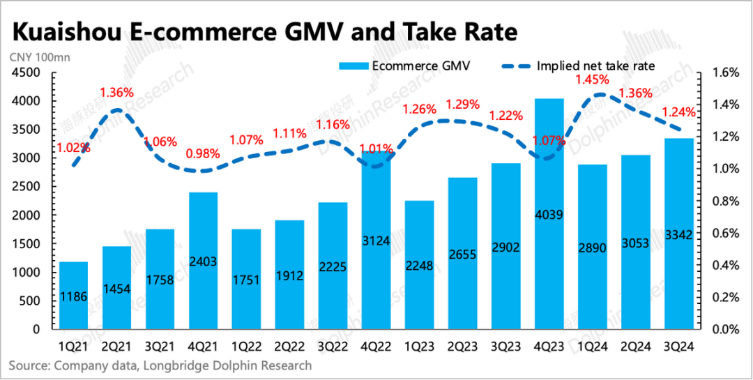 三季度電商收入同比增速17.5%,預期之中受到了一些邊際上的壓力。拆分來看,GMV 3342億,同比增速15%,傭金率1.24%,環比下降。