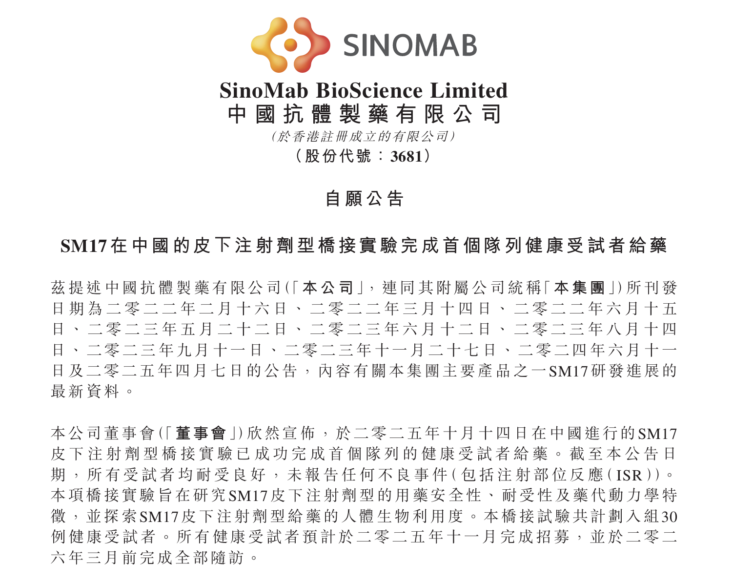 公告顯示,全球首創(First-in-Class)藥物SM17的皮下注射劑型橋接試驗,已成功完成首個隊列健康受試者給藥,且所有受試者均耐受良好,未報告任何不良事件(包括注射部位反應,ISR)。這也是對此前臨床試驗優秀成果的再次強化,尤其是耐受性和安全性。