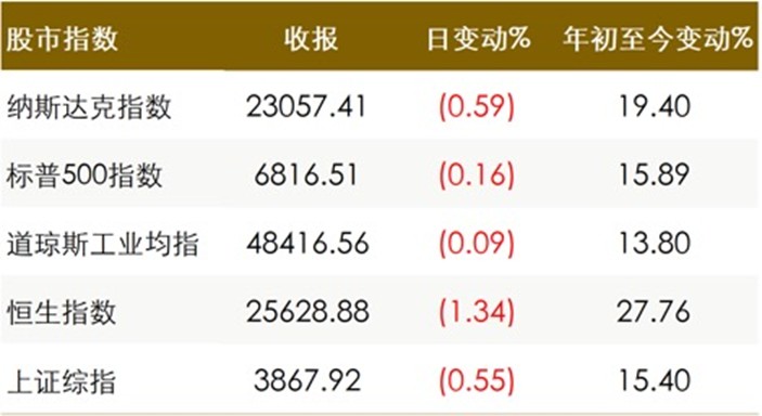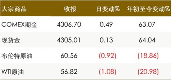 l 美國華爾街股市周一收跌,投資者為本周晚些時候的一系列經濟數據做準備,同時評估有關美聯儲主席候選人的報導和政策制定者發言。美元兌日圓走低,本周央行決策和美國數據密集,可能會對美聯儲的近期政策前景産生影響。油價下跌,投資者評估美國與委内瑞拉緊張局勢升級造成的幹擾、供應過剩擔憂以及俄羅斯與烏克蘭潛在和平協議的影響。現貨金回吐盤中漲幅收平,此前美國官員與烏克蘭總統澤連斯基旨在結束戰争的重要會談取得進展。