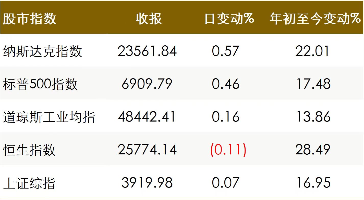 美國股市周二上漲,标普500指數創下收盤新高,經濟增長等一系列經濟數據推高公債收益率,提振成長股。美國公債收益率回吐稍早漲幅,盡管美國第三季度經濟增長超過預期,但消費者信心降至4月以來的最低水平。美元走軟,盡管數據顯示美國經濟增長強勁,但未能改變市場對美元的看法,因預期美聯儲明年将降息。油價收高,投資者評估委内瑞拉和俄羅斯石油供應中斷的風險。金價觸及曆史高位,白銀延續創紀錄的漲勢,突破每盎司70美元的關鍵關口。